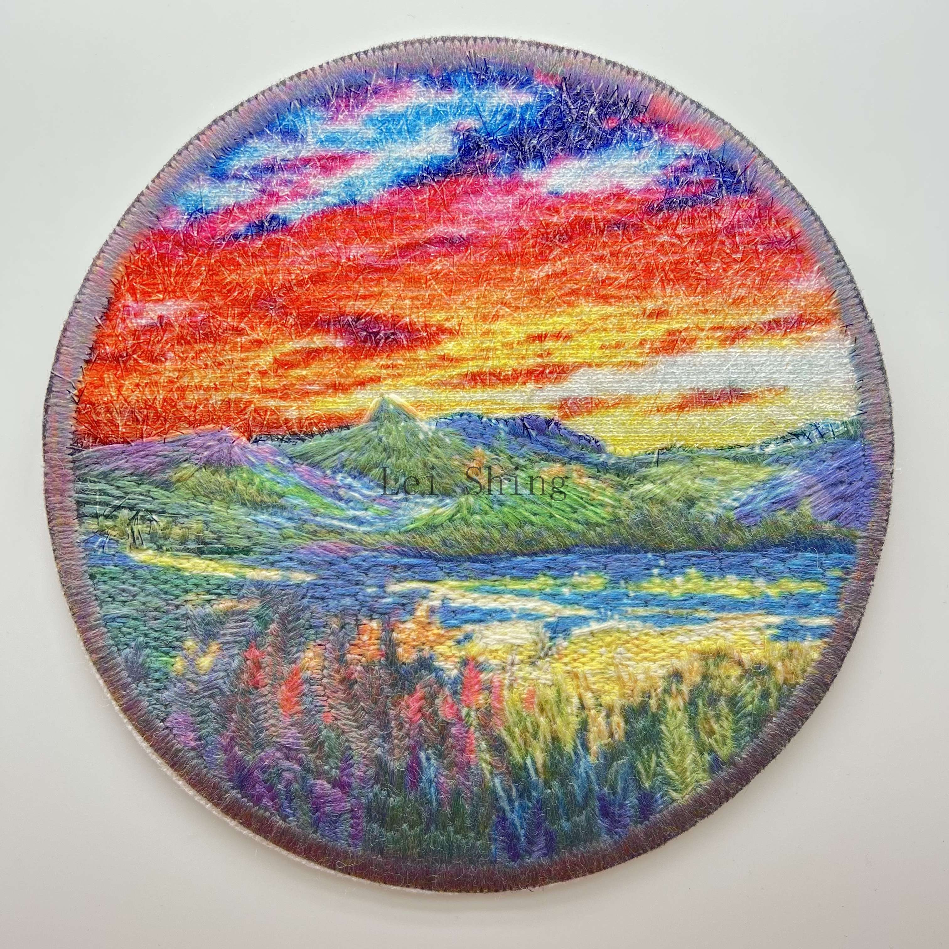 整體採用「印象派風格」的色彩暈染 —— 頂部日落以紅、橙、紫、藍交織出絢麗天際,中層山林的綠、紫層次與湖麵的光影反射呼應,底層草叢的繽紛色線模擬自然肌理,讓刺繡章擁有「微型畫作」的藝術感。